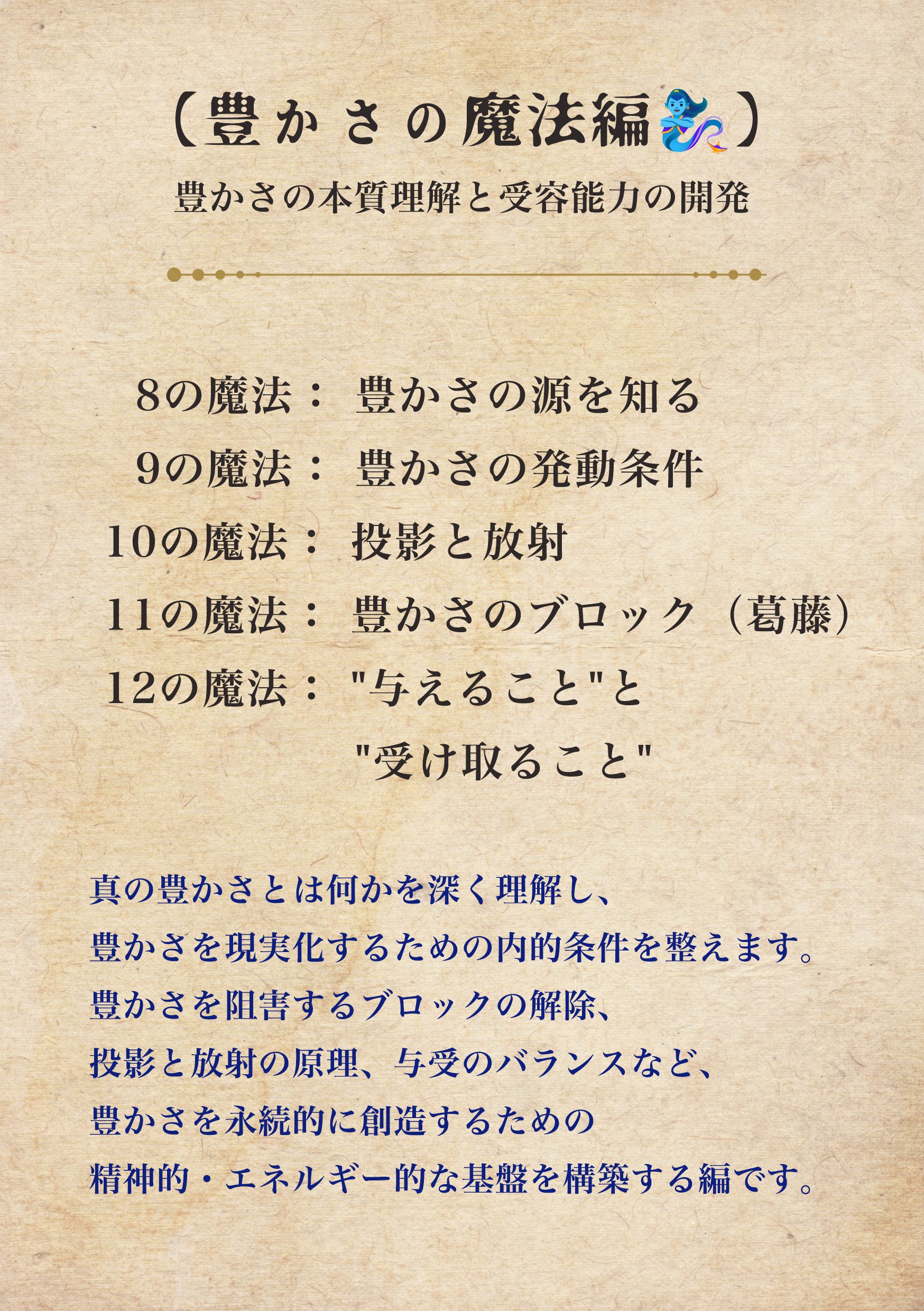 各魔法は、読むだけでなく、日常に取り入れながら、あなたの中にある”豊かさを現実化する魔法”を育てていきます。